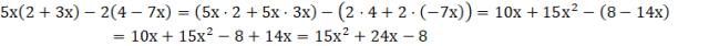 W tym zadaniu musisz przemnożyć nawiasy przez 5x i 2, a następnie zredukować wyrazy podobne.