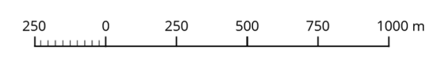 Na podstawie skali liczbowej, wiesz, że 1 cm na mapie to 25 000 cm. Do zapisania skali mianowanej musisz zamienić centymetry na metry. Skala liniowa przedstawia graficznie skalę przy pomocy opisanej osi. Jeden przedział o długości 1 cm będzie miał oznaczenie 250 m.
