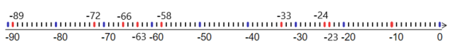 Zauważ, pomiędzy 0 i -10 znajduje się 10 kreseczek, czyli każda z nich oznacza różnicę o 1 stopień Celsjusza. Liczby są ujemne, czyli większe wartości bezwzględne znajdują się na lewo. Odszukaj wielokrotność liczby 10, która jest najbliżej danej temperatury i przesuń się o odpowiednią ilość miejsc (np. dwie kreseczki w prawo to 2 stopnie cieplej (wartość bezwzględna się zmniejsza), a dwie kreseczki w lewo to 2 stopnie zimniej (wartość bezwzględna się zwiększa). Aby oś była czytelna, niektóre liczby umieszczaj nad nią, a inne pod nią.