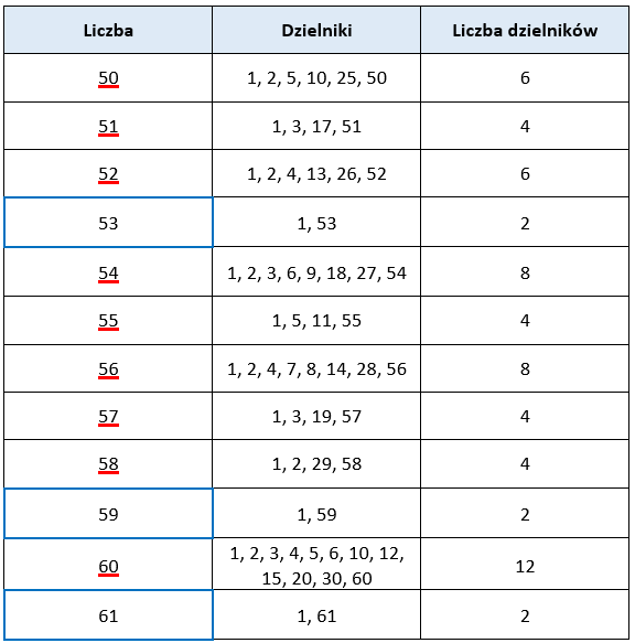 Liczbą pierwszą nazywamy liczbę naturalną, która posiada wyłącznie dwa dzielniki – jedynkę oraz samą siebie. Liczbą złożoną nazywamy liczbą naturalną, która posiada więcej niż dwa dzielniki. Zauważ, że liczba dzielników dla każdej liczby jest parzysta.