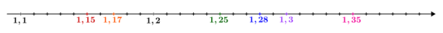 Podane liczby 1,15; 1,17; 1,25; 1,28; 1,3; 1,35 zaznacz w odpowiednim miejscu osi liczbowej.