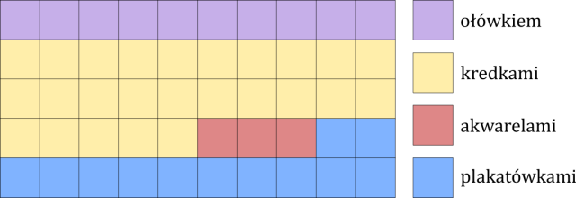 Więc cały diagram będzie miał 50 kratek, odpowiedź „ołówkiem” zajmie 10 z nich, odpowiedź „kredkami” zajmie 10 z nich, odpowiedź „akwarelami” zajmie 10 z nich, a odpowiedź „plakatówkami” zajmie 10 z nich.