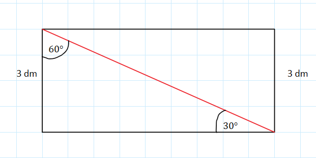 W prostokącie powstały dwa trójkąty prostokątne, gdzie każdy z nich jest połową trójkąta równobocznego. Długość przekątnej jest zatem dwa razy dłuższa od długości boku krótszego, a dłuższy bok obliczymy z twierdzenia Pitagorasa: