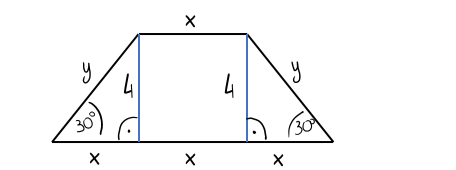 Narysuj rysunek z oznaczeniami jak w rozwiązaniu, następnie oblicz długość boku y korzystając z funkcji trygonometrycznych. Oblicz długość boku x korzystając z twierdzenia Pitagorasa. Podaj długości boków tego trapezu.