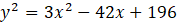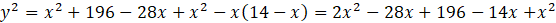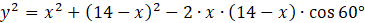 Oznacz długości boków trójkąta, których suma jest równa 14 jako x oraz 14 – x. Następnie zapisz dla danego trójkąta równanie wynikające z twierdzenia cosinusów – bok przeciwległy do kąta 60