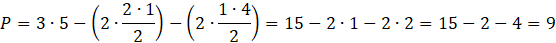 Aby obliczyć pole równoległoboku, musisz wpisać go w prostokąt o wymiarach 3 x 5. Pole równoległoboku jest równe różnicy pola prostokąta i pola powstałych trójkątów.