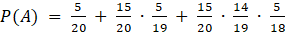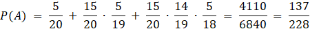 Prawdopodobieństwo zdarzenia A to suma następujących zdarzeń: wylosowano kotka za pierwszym razem spośród 5 kotków z 20 maskotek lub wylosowano za pierwszym razem dowolną maskotkę, a za drugim kotka spośród 5 kotków z 19 pozostałych maskotek lub za pierwszym i drugim razem wylosowano inną maskotkę, a za trzecim razem kotka. Sumując te wyniki otrzymasz