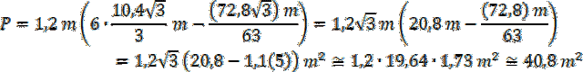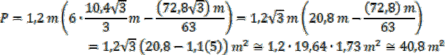 Ściany postanowiono wyłożyć drewnianą boazerią do wysokości 1,2 m od poziomu podłogi. Powierzchnię wykładaną Oblicz, mnożąc obwód sześciokąta (bez drzwi) razy wysokość 1,2 m: