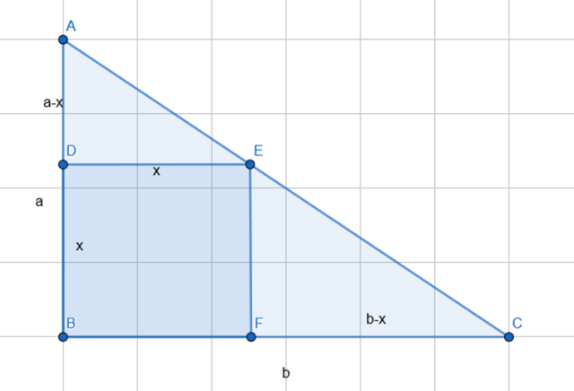 Udowodnij, że długość boku kwadratu, wpisanego w trójkąt prostokątny, jest równa