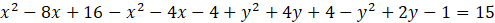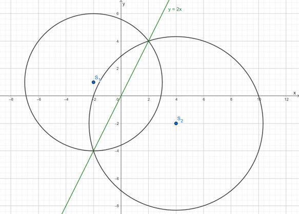 . W tym samym układzie narysuj prostą, powstałą przez odejmowanie stronami równań okręgów, a następnie sprawdź graficznie i algebraicznie, czy przechodzi ona przez punkty wspólne tych okręgów.