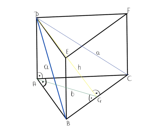Skorzystaj z twierdzenia Pitagorasa dla trójkąta GCD i oblicz h. Zauważ, że odcinek AG podzielił trójkąt ABC na 2 trójkąty przystające prostokątne i równoramienne. Aby wyznaczyć wysokość graniastosłupa, skorzystaj z twierdzenia Pitagorasa dla trójkąta AGD.