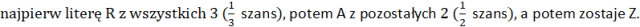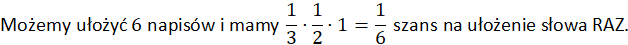 Losujesz z woreczka. Najpierw masz 3 litery do wyboru, potem 2, a na końcu została jedna. Zatem możesz ułożyć 3 ⋅ 2 ⋅ 1 = 6 różnych napisów. Żeby ułożyć napis RAZ, musiuusz wylosować