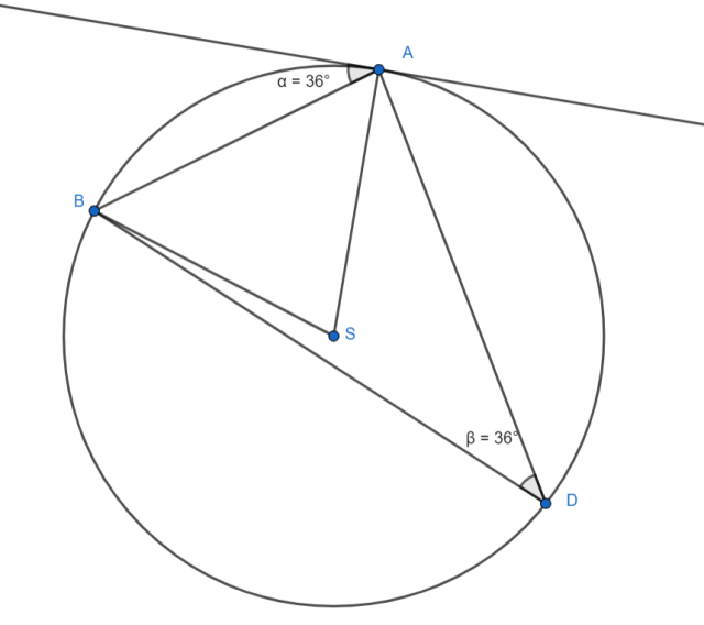 Kąt między styczną a cięciwą okręgu jest równy kątowi wpisanemu, opartemu na łuku wyznaczonemu przez końce cięciwy.