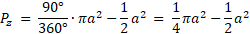 Zacznij od obliczenia pola kwadratu i pola połowy kwadratu. Pole połowy zielonej figury możesz obliczyć jako różnicę pola wycinka koła o kącie środkowym