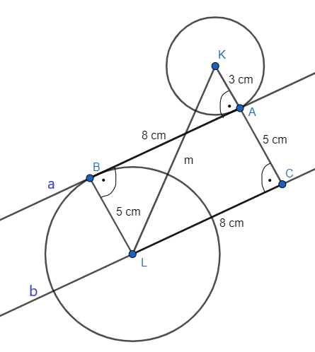 Okrąg ośrodku K i promieniu 3 cm jest styczny w punkcie A do prostej a. Na przeciwległej stronie tej prostej znajduje się okrąg o środku L i promieniu 5 cm, styczny do prostej a w punkcie B (zgodnie z rysunkiem). Odległość między punktami A i B wynosi 8 cm. Teraz obliczymy odległość między środkami tych okręgów.