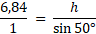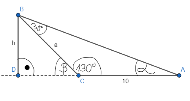 Zacznij od obliczenia miary kąta alfa z sumy kątów w trójkącie ABC. Następnie wykorzystaj kąty przyległe i oblicz miarę kąta beta. Oblicz długość a korzystając z twierdzenia sinusów w trójkącie ABC i oblicz długość h korzystając z twierdzenia sinusów w trójkącie DBC.