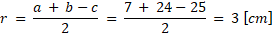 Wyznacz różnicę między długością promienia okręgu opisanego i promienia okręgu wpisanego w trójkąt, którego boki mają długości 7 cm, 24 cm i 25 cm.