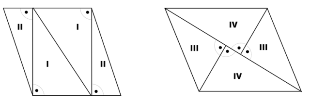 W tym zadaniu wytnij z papieru dwa dowolne równoległoboki, a następnie rozetnij je tak, aby otrzymać cztery trójkąty prostokątne (w tym po dwie pary trójkątów przystających).