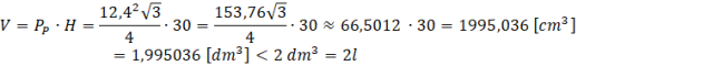 Czy wazon o kształcie graniastosłupa prawidłowego trójkątnego, gdzie krawędź podstawy ma długość 12,4 cm, a wysokość wynosi 30 cm, będzie mógł pomieścić 2 litry wody?