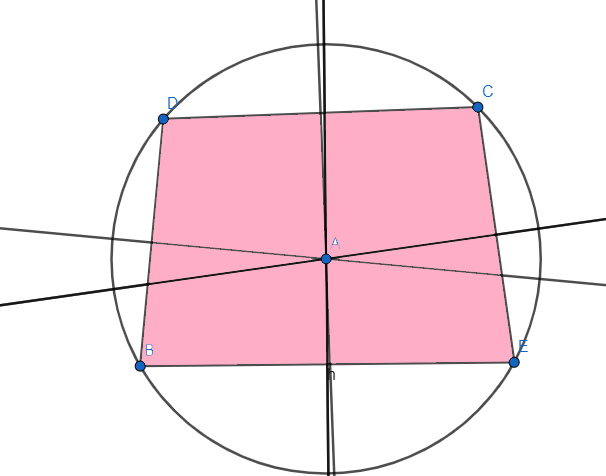 Przykładowy rysunek powyżej. Symetralne boków czworokąta wpisanego w okrąg przecinają się w środku tego okręgu. Jeśli wyznaczysz symetralne boków, możesz narysować okrąg, który przechodzi przez wierzchołki czworokąta.