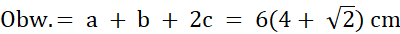 Zauważ, że jeśli w trapezie suma kątów wewnętrznych wynosi 360° i kąt rozwarty ma 135°, to w związku z tym, że jest to trapez równoramienny kąt ostry ma 45°. Dłuższa podstawa natomiast a = b + 2x.