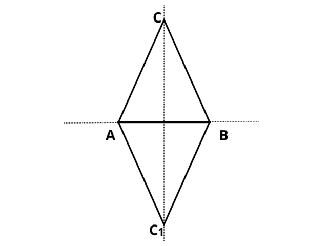 Pamiętaj, że figury symetryczne są przystające. Przekształcano względem AB wiec już jest ona jedną z osi. W związku z tym, że |AC| = |CB| to CC1 jest drugą osią symetrii.