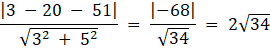Znane są współrzędne środka okręgu S. Aby napisać jego równanie, powinieneś znaleźć długość jego promienia. Jest to równica pomiędzy podana odległością najdalej położonego punktu na okręgu od prostej a odległością środka tego okręgu od prostej. Odległość punktu S od prostej