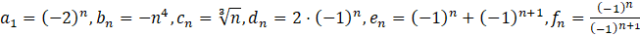 Z kolei ciągi (an) i (dn) są rozbieżne i nie mają granicy niewłaściwej, ponieważ każde kolejne wyrazy ciągu są naprzemiennie dodatnie i ujemne.