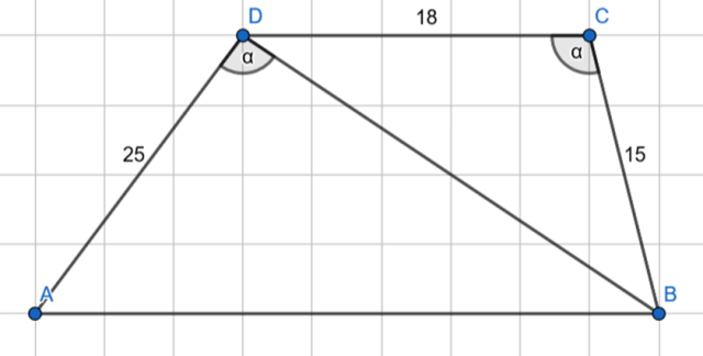 Zauważ, że skoro proste AB i CD są równoległe, to kąty CDB i DBA mają równe miary. Z treści zadania wiadomo, że kąty ADB i BCD mają równe miary, więc kąty BAD i DBC też będą takie same. Oznacza to, że trójkąty przedstawione na rysunku są podobne z cechy KKK.