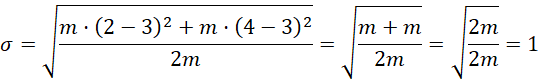 Wyznacz odchylenie standardowe zestawu danych, w którym jest m liczb 2 i m liczb 4.