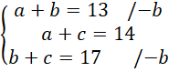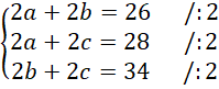 Wyznacz długości krawędzi prostopadłościanu, jeśli jego jedna ściana ma obwód 26 cm, druga 28 cm, a trzecia – 34 cm.