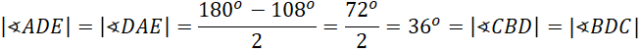 Następnie zauważ, że trójkąty AED, ABD i BCD są równoramienne, więc miara ich kątów przy podstawach będzie taka sama. Dodatkowo skorzystaj z tego, że suma miar kątów w trójkącie wynosi
