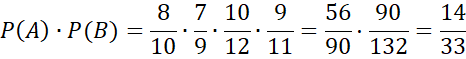 Wyznacz prawdopodobieństwo tego, że student zda egzamin, jeśli musi odpowiedzieć poprawnie na wszystkie wylosowane pytania, jeśli student zna odpowiedzi na 8 spośród 10 pytań w części I egzaminu i na 10 spośród 12 w części II egzaminu i na egzaminie losuje się po 2 pytania z każdej jego części.