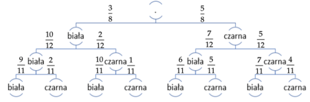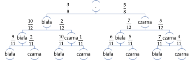 Z pierwszej urny wylosowano kulę białą, więc do drugiej urny przełożono trzy kule białe. Wtedy w drugiej urnie znajduję się 10 kul białych i 2 czarne.