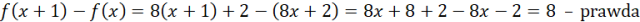 | Gdy argument funkcji określonej wzorem f(x)=8x+2 wzrośnie o 1, to wartość funkcji wzrośnie o 8. | P |