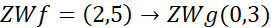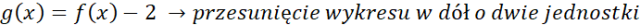 Przesuwając wykres funkcji f o dwie jednostki w dół, dziedzina pozostanie bez zmian, natomiast zbiór wartości przesunie się. Liczba 0 nie należy do zbioru wartości funkcji g co oznacza, że funkcja nie ma miejsc zerowych.
