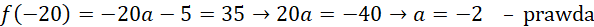 | Wykres funkcji liniowej f określonej wzorem f(x)=ax-5 przechodzi przez. punkt (-20,35), gdy a = -2. | P |