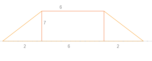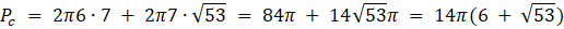 Pole powierzchni powstałej bryły będzie równe sumie polu bocznego walca o promieniu 7 i wysokości 6 oraz dwóm polom bocznym stożka o promieniu 7 i wysokości 2