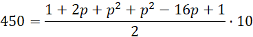 Wylicz wartość p, wiedząc, że suma dziesięciu początkowych wyrazów ciągu arytmetycznego, którego początkowe wyrazy to: (1 + p)2, 1 + p2, (1 - p)2, wynosi 450.