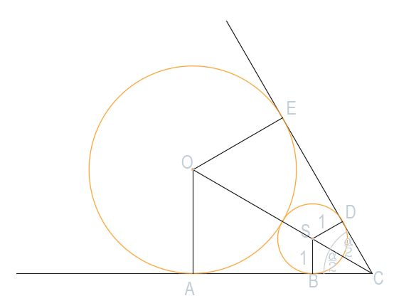 Dane są dwa okręgi styczne do siebie i do ramion kąta α. Znajdź promień większego okręgu, jeśli mniejszy ma promień 1 a kąt
