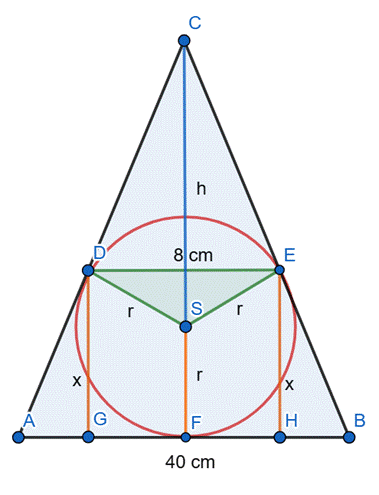 W tym zadaniu musisz obliczyć pole trójkąta DEC, wiedząc, że w trójkącie równoramiennym ABC podstawa AB ma długość 40 cm. Wiadomo, że w dany trójkąt wpisano koło, które jest styczne do ramion trójkąta w punktach D i E oraz