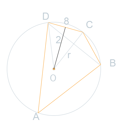 Czworokąt o boku 8 jest wypisany w okrąg. Odległość między tym bokiem a środkiem okręgu wynosi 2. Wyznacz długość promienia okręgu.