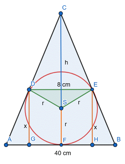 W tym zadaniu musisz obliczyć pole czworokąta ABED, wiedząc, że w trójkącie równoramiennym ABC podstawa AB ma długość 40 cm. Wiadomo, że w dany trójkąt wpisano koło, które jest styczne do ramion trójkąta w punktach D i E oraz