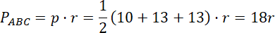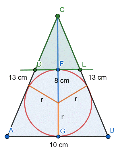 Najpierw oblicz wysokość trójkąta ABC korzystając z twierdzenia Pitagorasa, następnie wyznacz długość promienia okręgu wpisanego w dany trójkąt. Zauważ, podobieństwo dwóch trójkątów i wyznacz skalę tego podobieństwa, aby następnie obliczyć szukane pole trójkąta DEC.