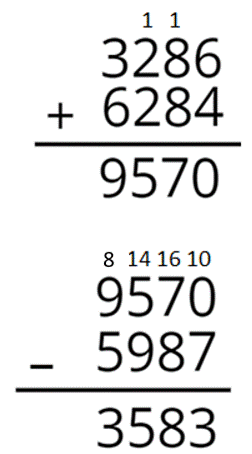 3286 + 6284 – 5987 = 9570 – 5987 = 3583