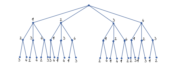 W tym zadaniu musisz wypisać wszystkie powstałe trzycyfrowe liczby, które są złożone z cyfr ze zbioru {1, 2, 3, 4}. Wykonaj drzewo.
