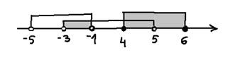 Narysuj oś liczbową. Zaznacz na osi podane przedziały liczbowe. Najpierw wykonaj działanie w nawiasie – wyznacz cześć wspólną przedziałów liczbowych. Następnie wyznacz sumę przedziałów liczbowych.