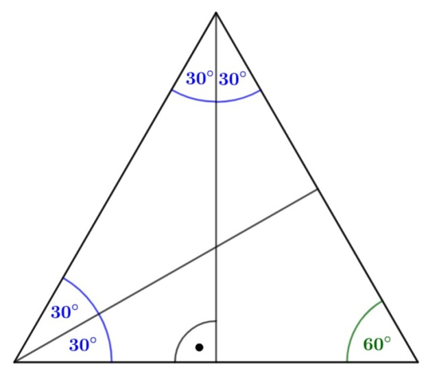 Dwusieczna kąta dzieli ten kąt na połowy. W trójkącie równobocznym, dwusieczne są też wysokościami trójkąta, więc kąt pomiędzy dwusieczną a przeciwległym bokiem jest równy