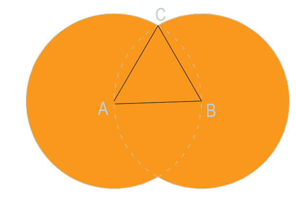 Dwa trójkąty ABC razem z łukami tworzą część wspólną obu okręgów: