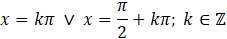 Odczytaj miejsca zerowe funkcji sinus i cosinus, a następnie zapisz rozwiązanie w odpowiedniej postaci.